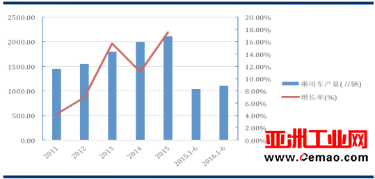 2015 年(nián),全國汽車産銷量(liang)分别為 2,450 萬輛和 2,460 萬(wàn)輛, 同比增長 3.29%和 4.68%。其(qí)中,乘用車産銷量(liang)分别為 2,108 萬輛和 2,114 萬(wàn)輛,同比增長 5.82%和 7.30%;商(shang)用車産銷量分别(bié)為 342 萬輛和 345 萬輛,同(tóng)比下降分别為❄️ 9.97%和(hé) 8.97%。 2016 年上半年,全國汽(qì)車産銷量分别為(wéi) 1,287 萬輛和 1,279 萬輛,同比(bi)增長 6.41%和 8.10%。其中,乘用(yong)🐅車産銷量分别為(wei) 1,108 萬輛和 1,101 萬輛,同比(bi)增長 7.25%和 9.23%;商用車産(chan)銷量分别為 179 萬輛(liang)和 179 萬輛,同比下降(jiàng)分别為 1.53%和 1.62%。2011 年至 2016 年(nian) 1-6 月乘用車🔆産量及(ji)增長率情況如下(xià):